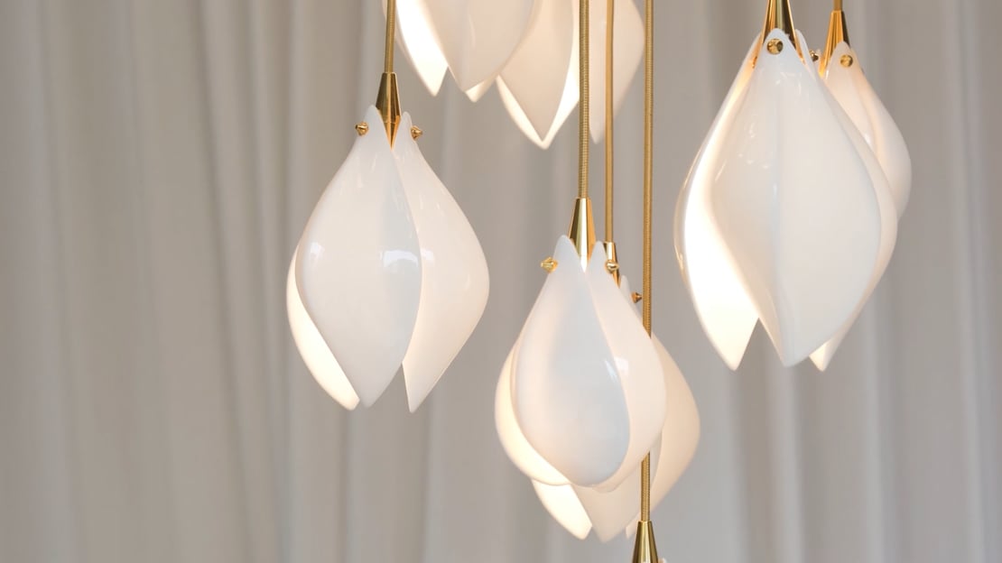 Each single flower has a unique character through its own delicate form: victoriously fragile, collectively radiant. Each Bloom bud captures this exquisite effect through delicate porcelain petals illuminated by integrated light sources to radiate warmth from the heart of the flower.