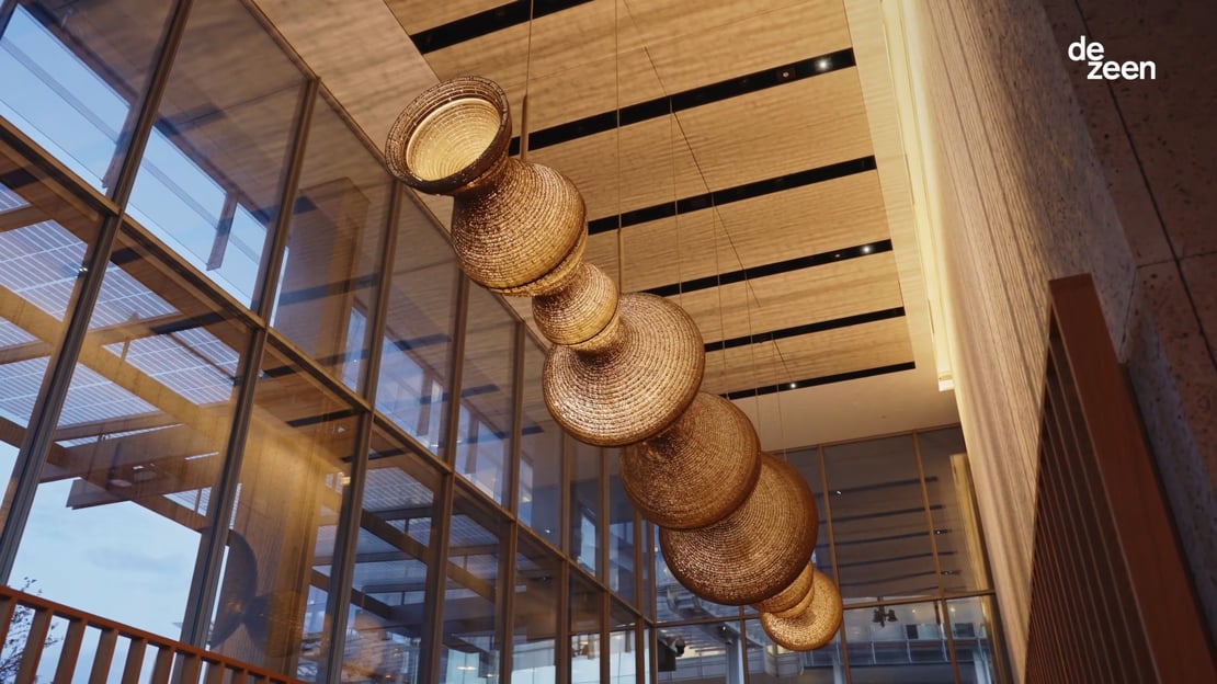Depending on the viewing angle the sculpture can be read quite differently. From an end-on-approach the sculpture can appear quite solid, whereas from directly underneath or from out on the street the sculpture has a more lightweight translucent appearance. Dappled light created by the myriad of apertures throughout the sculptural form spreads out over wall and floor surfaces to help inform and celebrate the surrounding material choices made by interior designers State of Craft. Our work is most successful when it intelligently references the language of its surroundings.